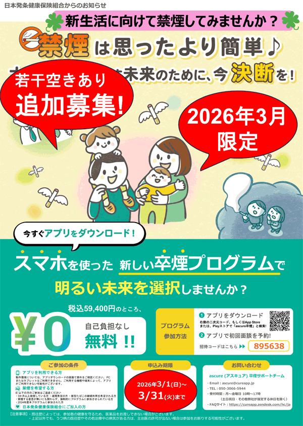 | 参加条件 | 禁煙を希望される方、アプリを利用できる方 (喫煙本数、喫煙年数は問わず) |
